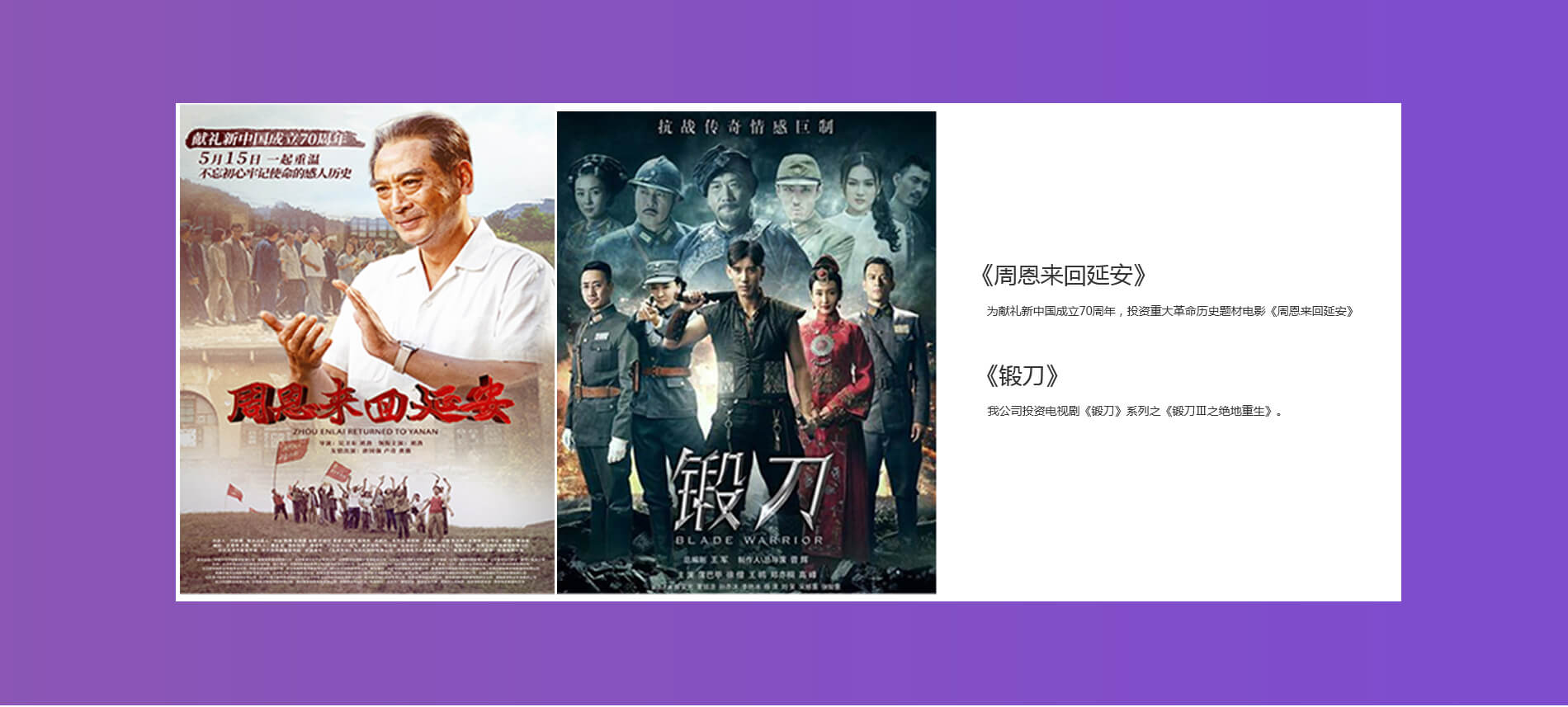 为献礼新中国成立70周年,投资重大革命历史题材电影《周恩来回延安》。2017年12月15日,电影项目启动仪式暨新闻发布会在钓鱼台国宾馆举行。电影《周恩来回延安》从创作之初就受到了中宣部、文化和旅行部、中共中央文献研究室、国家广播电视总局等单位的关注和指导,并得到了周恩来同志的亲属及他曾经的秘书、警卫等各界人士的大力支持。该片上映后受到社会各界的高度评价,不仅作为教学课程在中共中央党校点映,还入选中宣部、教育部等联合主办的“看红色电影,爱伟大祖国”优秀电影进校园系列活动播放影片。中宣部《党建》杂志社更是召开以“弘扬周总理崇高精神,不忘初心、牢记使命”为主题的研讨会,总结研讨了该片的艺术成就、思想内涵及现实意义。9月,该片获得了第十五届精神文明建筑“五个一工程”奖。 《周恩来回延安》以1973年6月被检查出患有癌症的周恩来总理回到阔别二十六年的延安,延安的十三年往事历历在目,这方热土养育了中国革命,养育了人民军队,形成了中国共产党第一代领导集体,铸就了中国共产党的领导地位。演绎一代伟人对人民的深情牵挂,讲述周恩来总理时隔26年回到革命圣地延安的短暂22小时,讴歌中国共产党与人民血肉相连及不忘初心、不懈奋斗、砥砺前行的伟大精神。 影片上映以来,人民网、emc全站网页版网、央视网等核心官方媒体纷纷给予肯定评价,好评如潮,可见影片影响之轰动和广泛。